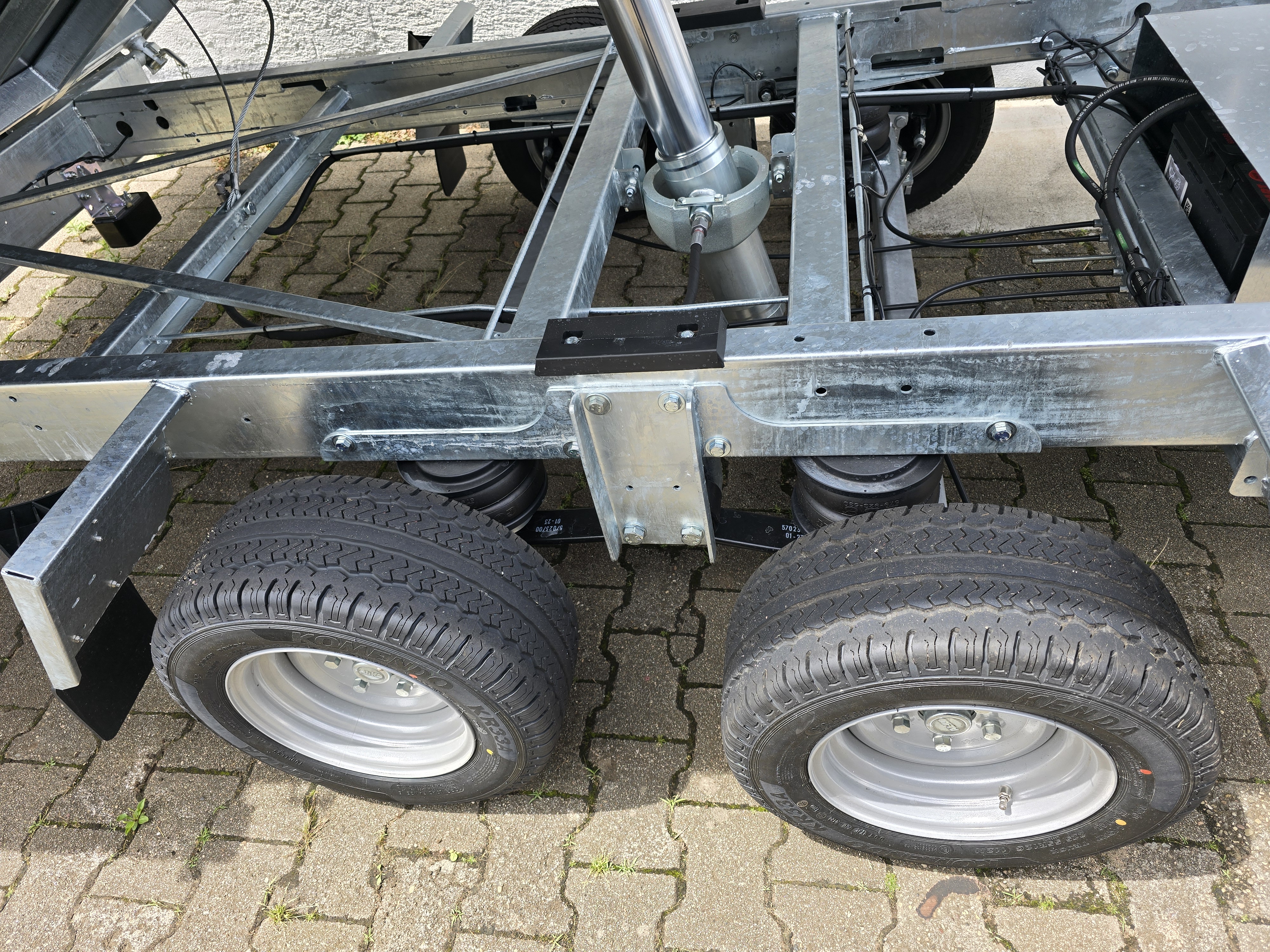 Hirth-Luftfederfahrwerk mit automatischem Achsausgleich (anstatt Gummifederachse) und überdimensionierten Radbremsen. Selbsteinspurend mit einmaligem Fahrkomfort durch Boogie-Ausführung. Es ist keine externe Luftversorgung erforderlich. Tauchbadfeuerverzinkung (optimaler Rostschutz) für eine lange Lebensdauer und hohe Laufleistung. Wartungsfreie Achsaufhängung, schraubbare Radnarben und Radstoßdämpfer für geringe Folgekosten. Parabelfeder als Längslenker.
